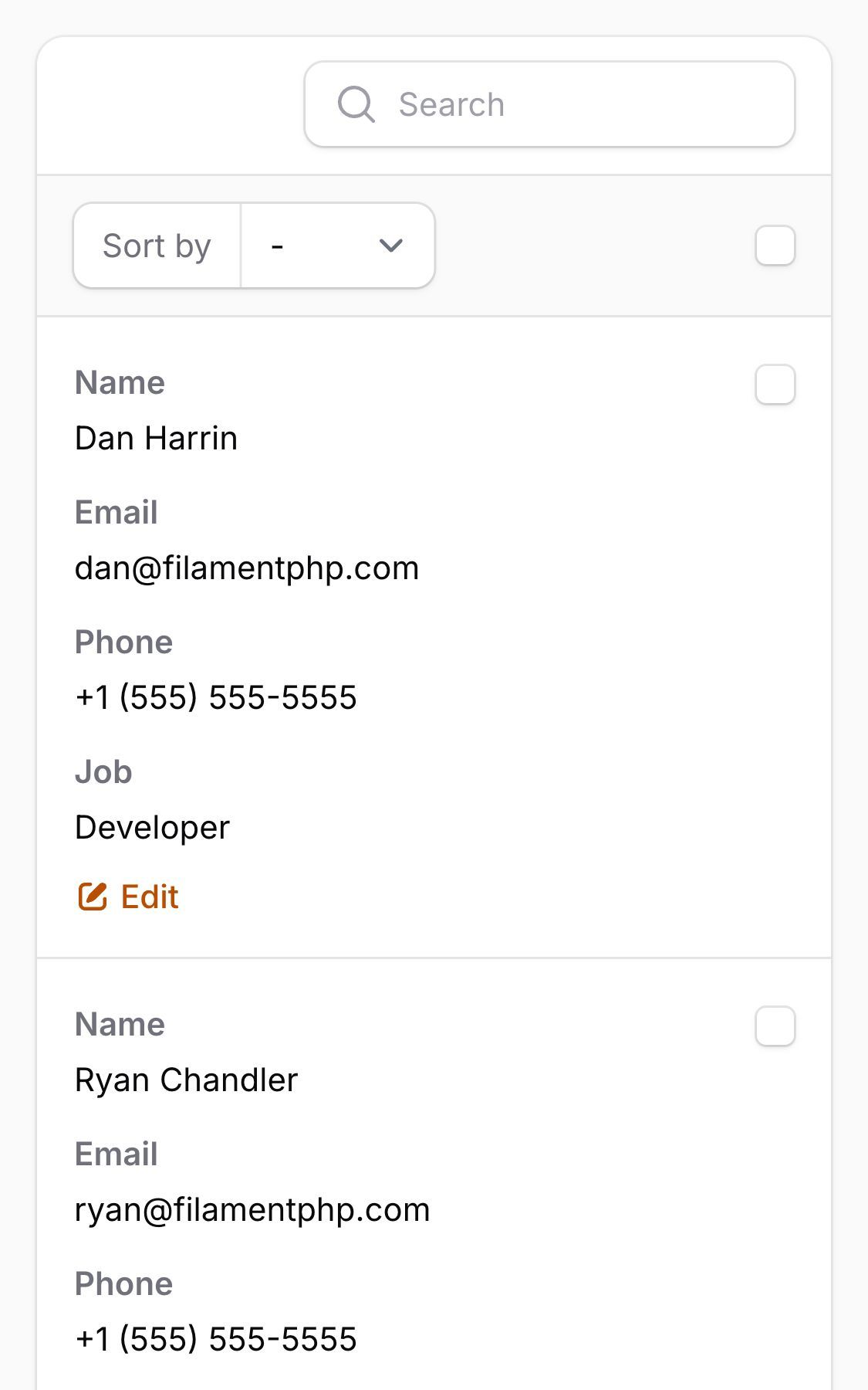 现在,移动屏幕上的表格支持垂直堆叠单元格,无需水平滚动即可显示。这种 CSS 优先的方法提高了小屏幕上的可读性,同时在大屏幕上保持了标准的水平布局。该功能与现有的响应式修饰符(例如 hiddenFrom() 和 visibleFrom())协同工作。